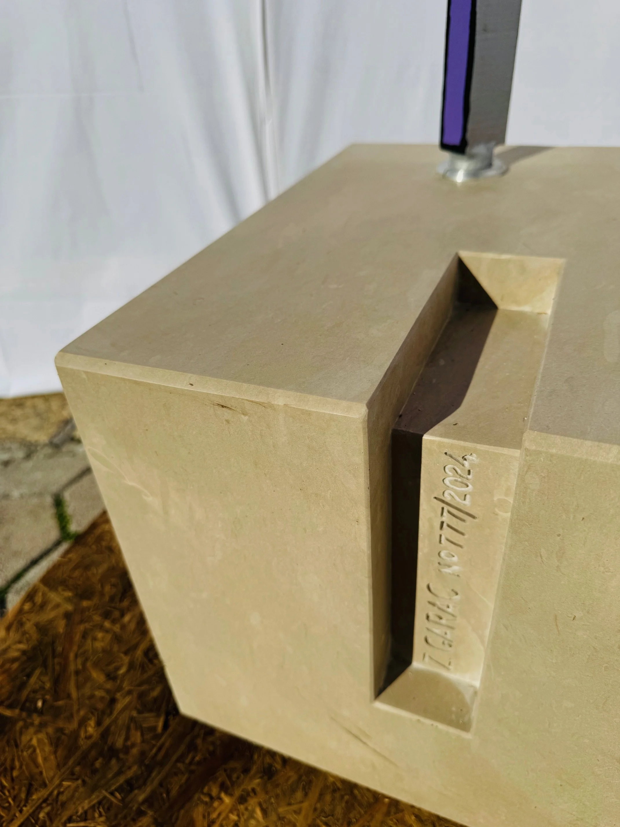No. 777, Stuck in the system, 2024. Steel and marble - 240 x 60 x 40 cm, 132 + 210 kg marble